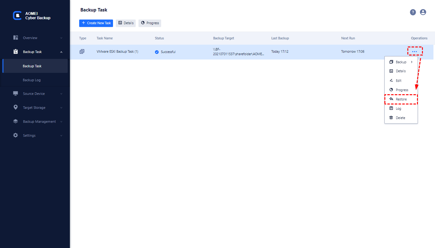 Step 6. Find the backup task you want to restore from the created backup tasks and click … > Restore. Select Restore to the original location to create the same data directly from the backup.