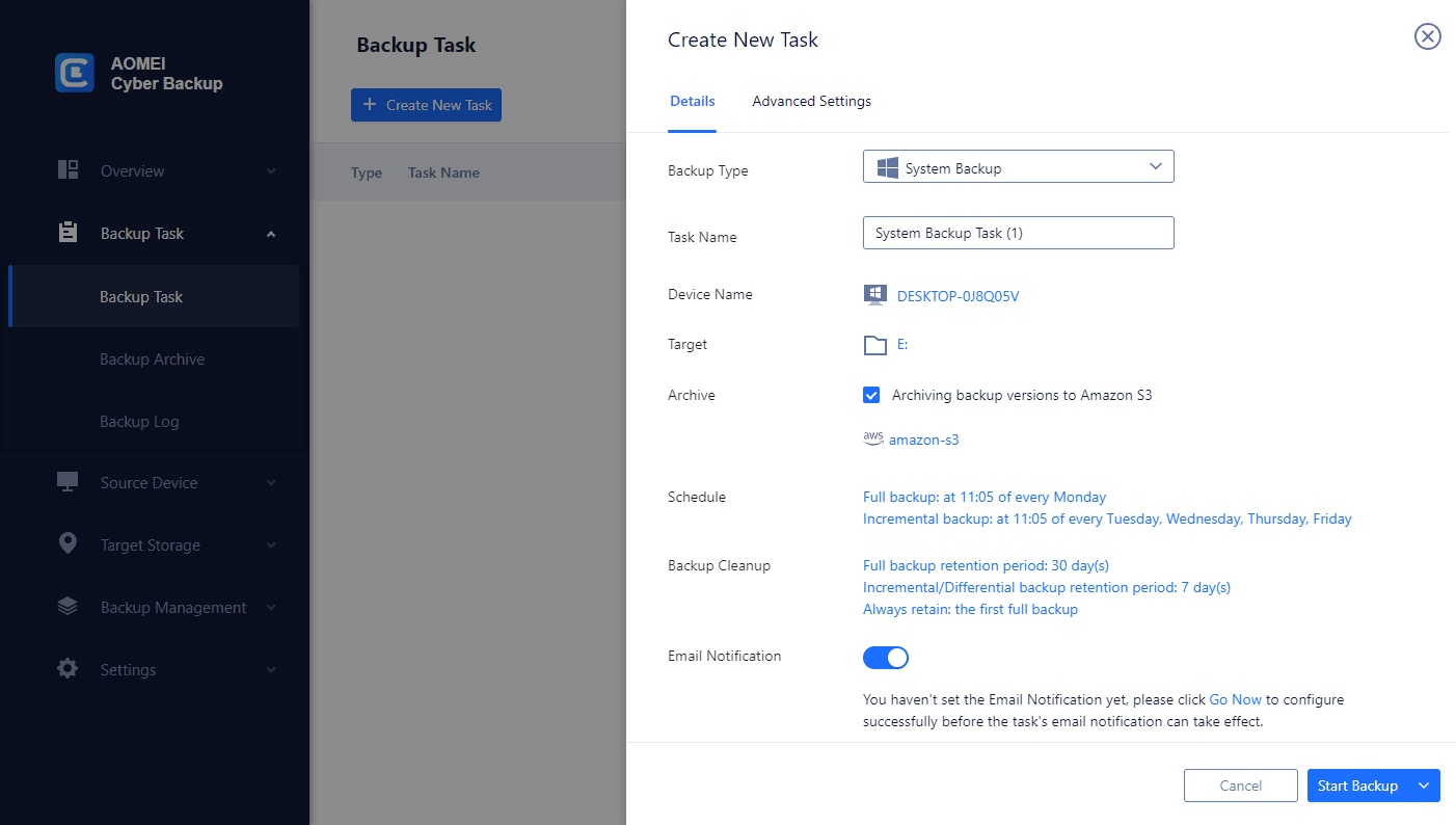 Backup Notifications: Receive email alerts for successful, failed, or missed backups.