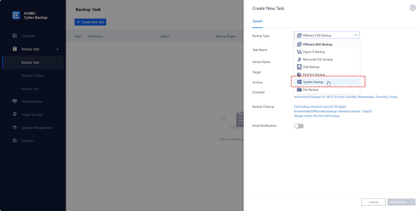 Step 2. Go to Backup Task > Create New Task > System Backup. It will back up the system partitions completely, including applications, drivers, configuration settings, system files, and boot files.