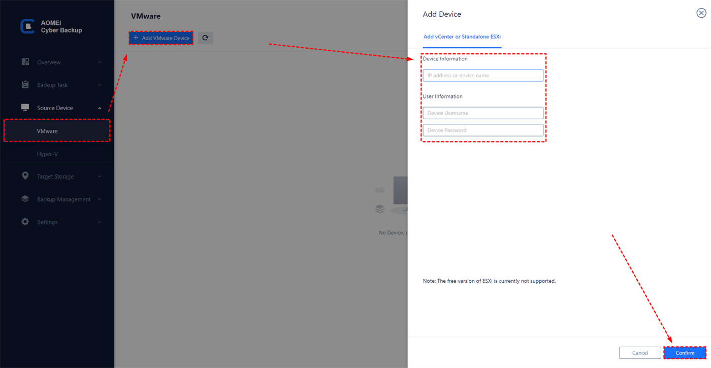Log in to the AOMEI Cyber Backup web client, navigate to Source Device > VMware > + Add VMware Device to add vCenter or Standalone ESXi host as the source device. Enter Device Information and User Information, then click Confirm.