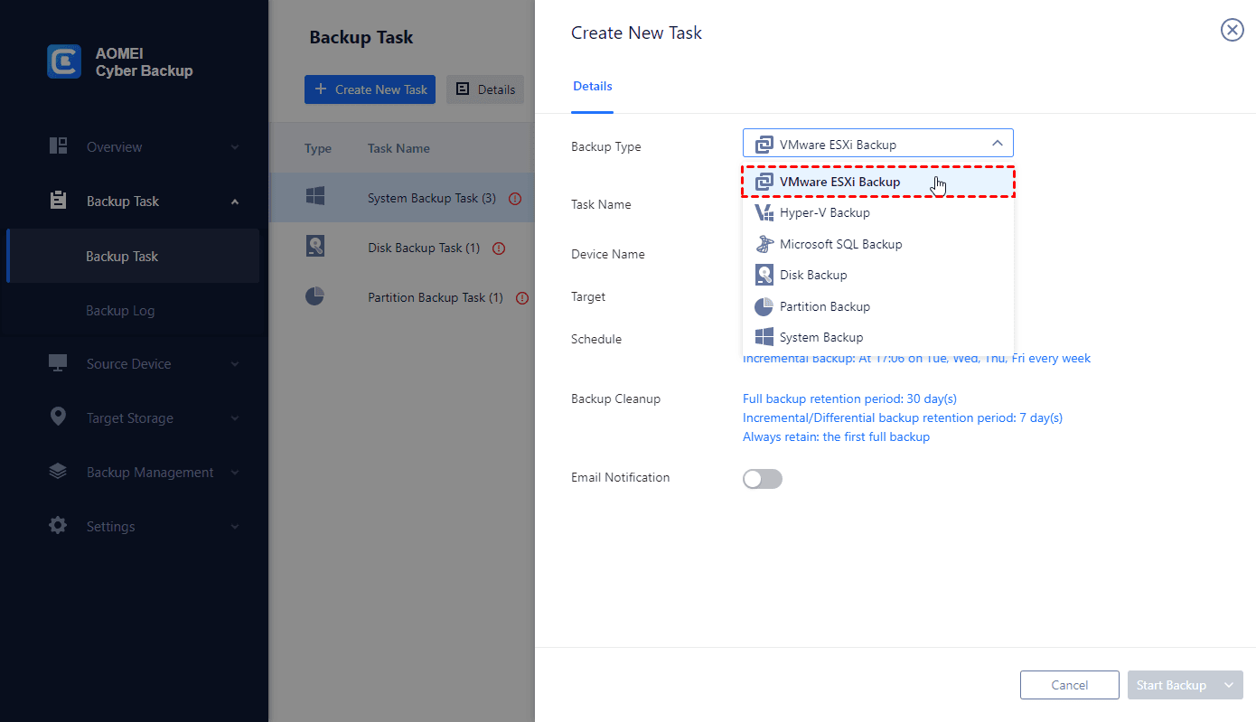 Navigate to Backup Type > + Create New Task, and select the Backup Type (VMware ESXi Backup, Hyper-V Backup, Microsoft SQL Backup, Disk Backup, Partition Backup, and System Backup), here we take VMware ESXi Backup as the Backup Type.