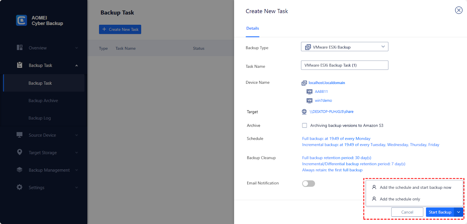 Click Start Backup and select Add the schedule and start backup now, or Add the schedule only.