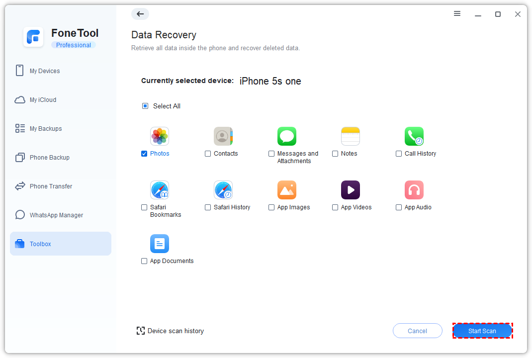 From the next page, select the types of files you want to recover (e.g., Photos, Contacts, Messages, Notes, App Videos, etc.). Click on Start Scan button to begin the scanning task. FoneTool will scan your iPhone for deleted files immediately.